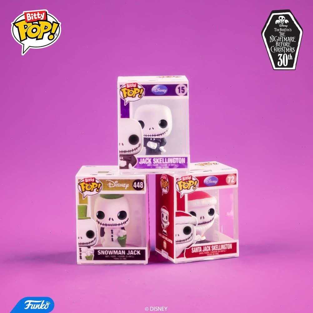 Your favorite Pops! have been shrunk into Bitty Pops! Expand your The Nightmare Before Christmas™ collection with this assortment of Bitty Pop! figures featuring your most beloved Halloween Town residents! This 4-pack includes Bitty Pop! Santa Jack, Bitty Pop! Sandy Claws, Bitty Pop! Vampire Teddy with Duck, and a mystery Bitty Pop! figure. The possible mystery Bitty Pops! are Hyper Rare (1/6) Mayor (smiling), Hyper Rare (1/6) Snowman Jack, Rare (1/3) Oogie Boogie (with bugs), and Rare (1/3) Harlequin Demon.