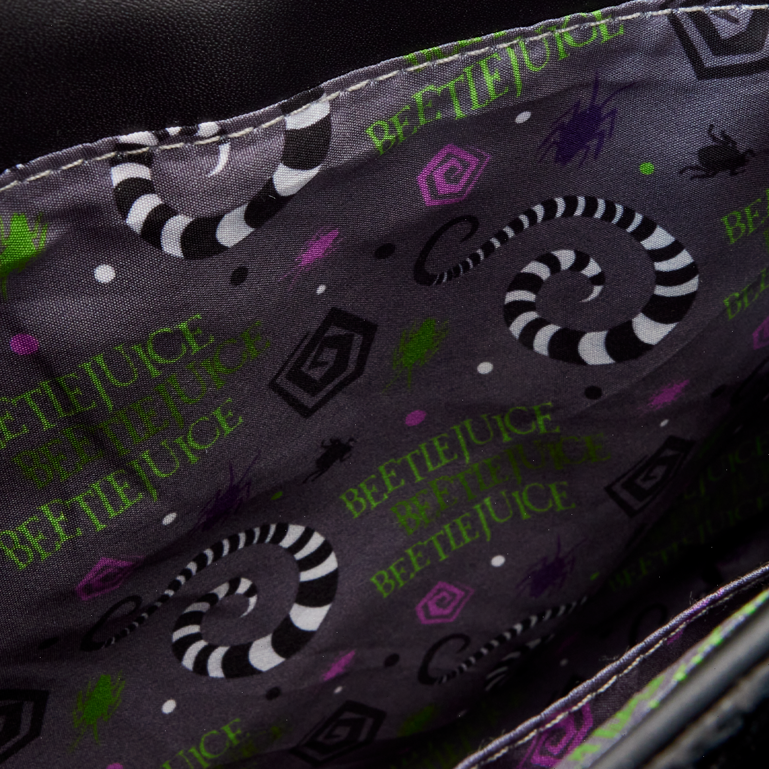 Traveling the deserts where the Sandworms live? Go in style! Bring along our gracefully ghoulish Beetlejuice Sandworm Crossbody Bag. Coiled like a sandworm from the movie, this creature comes to life in applique detail, with sumptuous black-and-white stripes. The menacing mouth opens, and you can see the head of another Sandworm inside. You can even pull that head out partway, but it snaps right back for an extra bite of fun. The full head of the Sandworm forms the front flap of the bag, and inside, you can find just enough room to pack what you need for a day trip. On the back, the Sandworm’s coil appears to drape down—and Beetlejuice peeks out. Make a hauntingly delightful impression wherever you go.