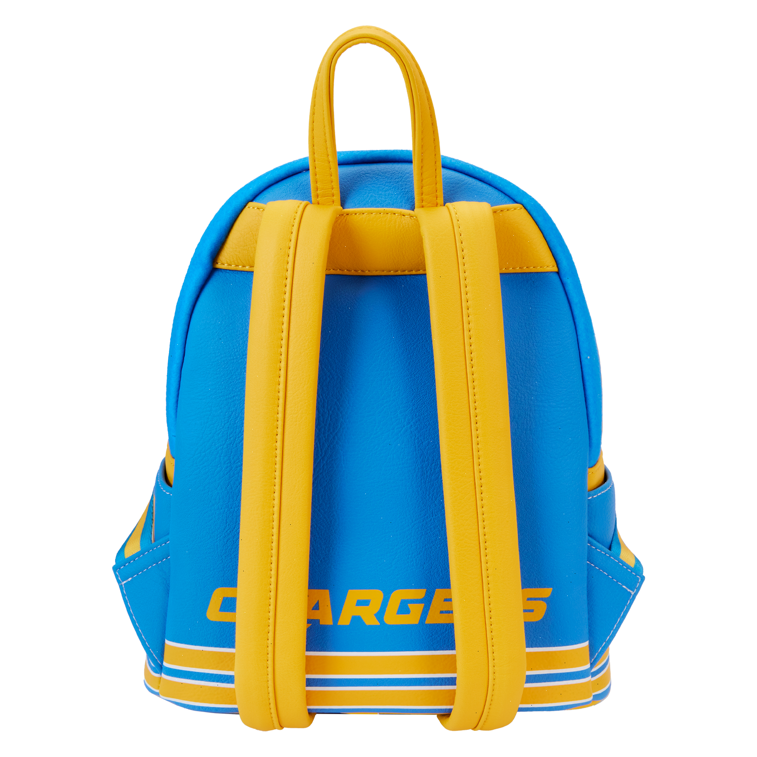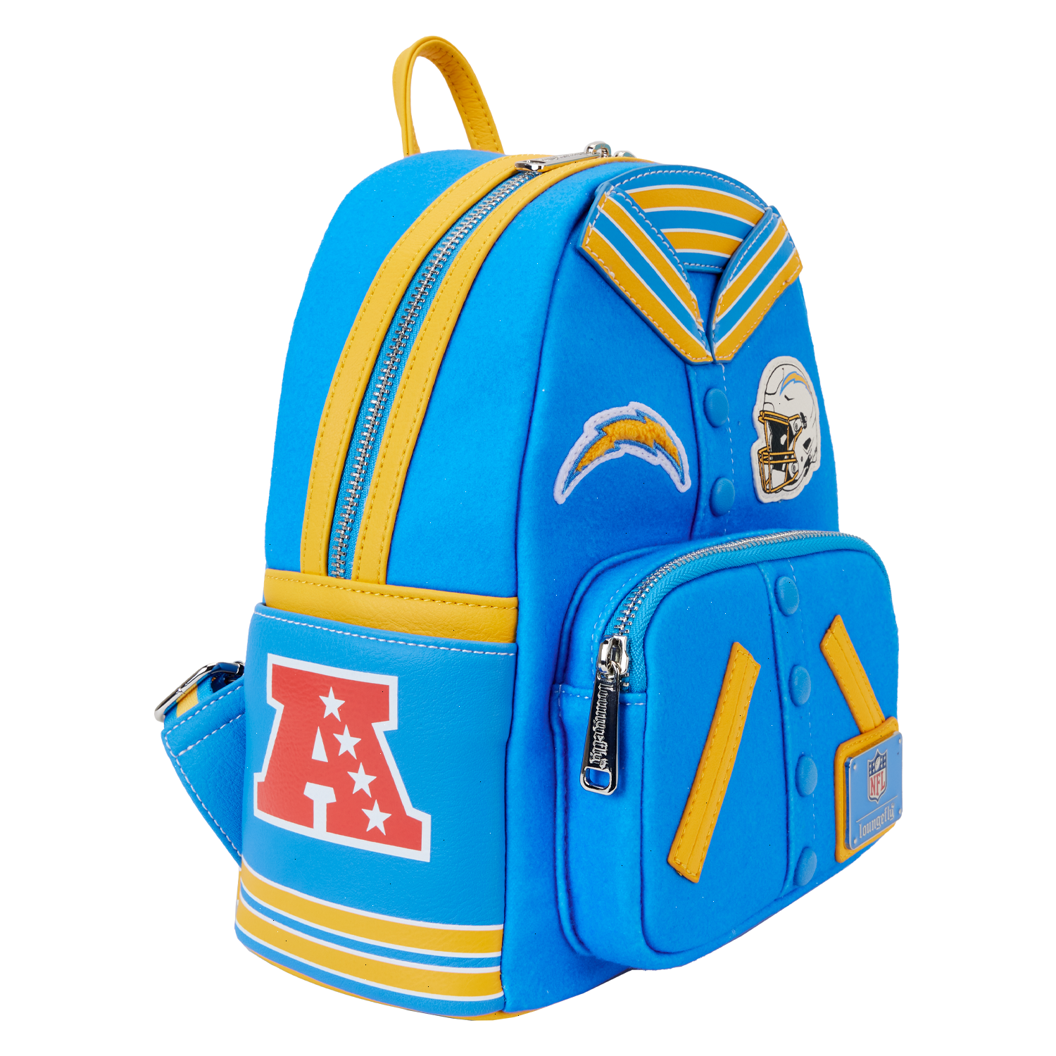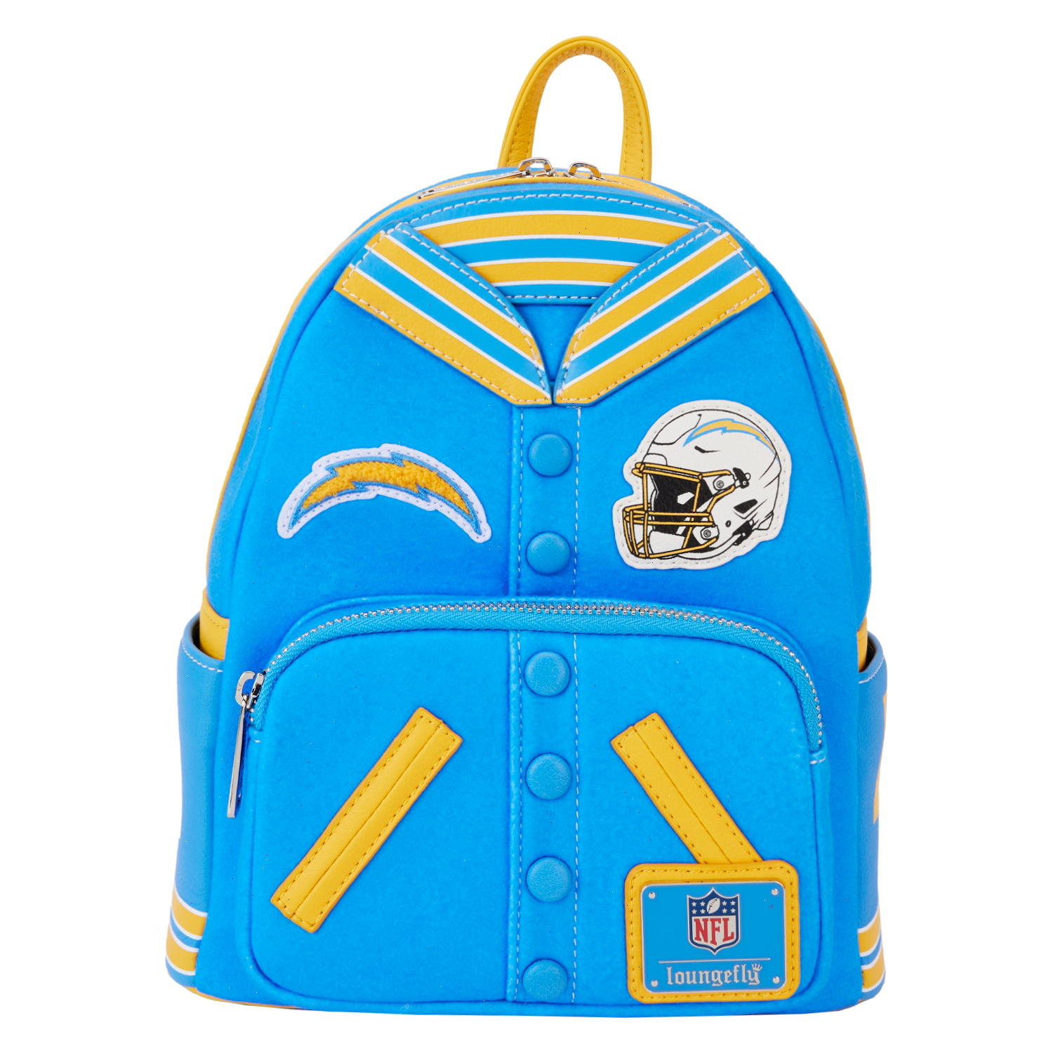 Show your colors proud and true—you've got spirit, yes you do! Cheer your team in style! Our sturdy Los Angeles Chargers Varsity Mini Backpack will stand out in the crowd. This backpack, fashioned as a varsity jacket, scores big points in details. A chenille patch logo and helmet patch add a winning look, along with yellow, blue, and white jersey material appliques in Los Angeles Chargers colors. Real metal snaps also line the front for a “buttoned-up” look. Pack just what you need for the day to show off your team pride.