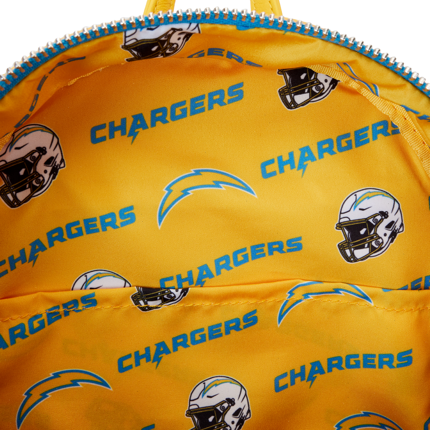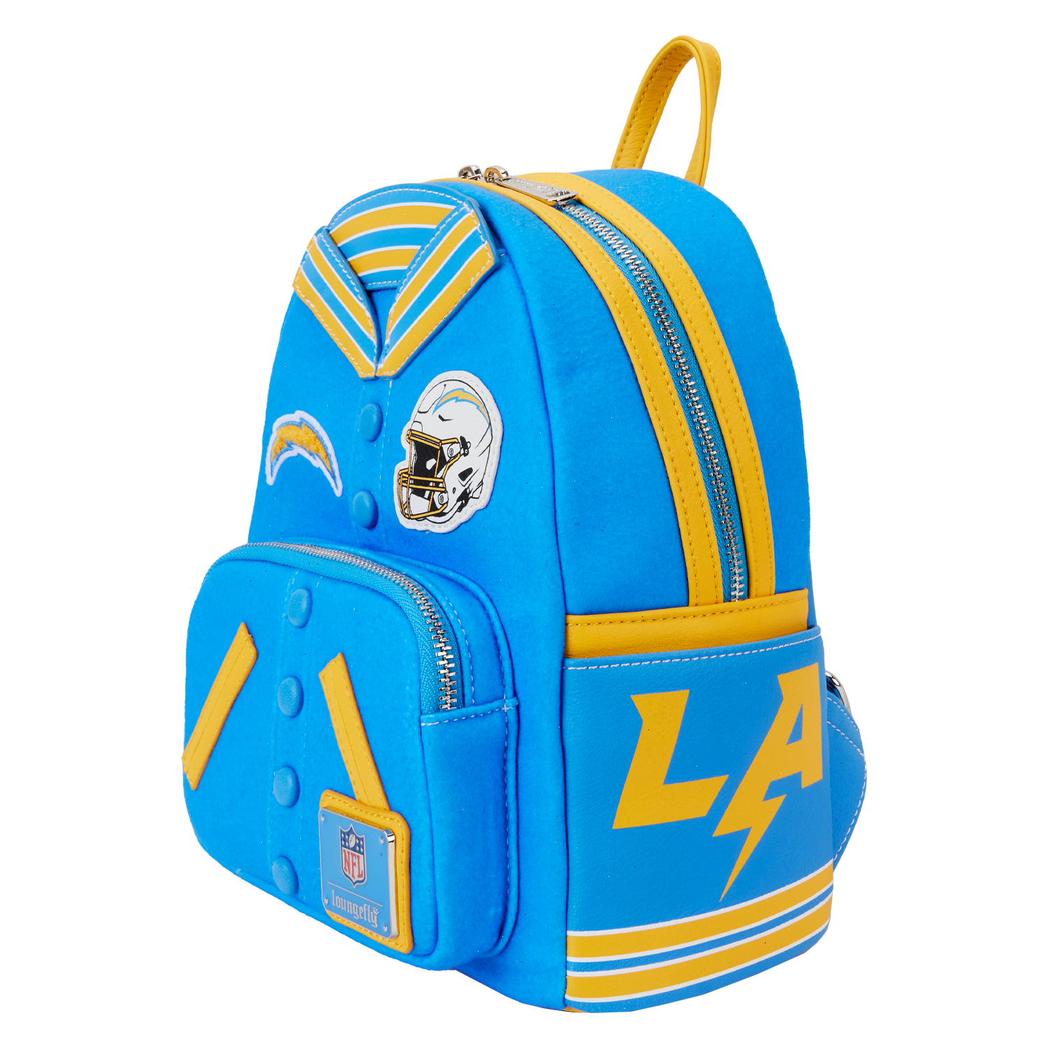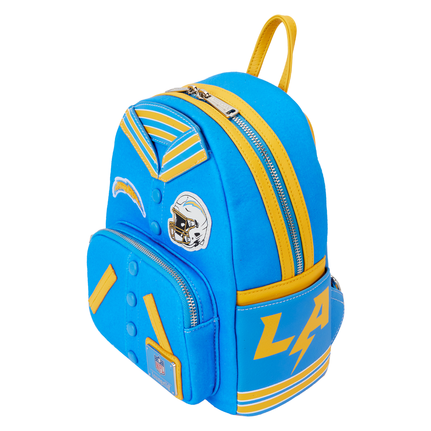 Show your colors proud and true—you've got spirit, yes you do! Cheer your team in style! Our sturdy Los Angeles Chargers Varsity Mini Backpack will stand out in the crowd. This backpack, fashioned as a varsity jacket, scores big points in details. A chenille patch logo and helmet patch add a winning look, along with yellow, blue, and white jersey material appliques in Los Angeles Chargers colors. Real metal snaps also line the front for a “buttoned-up” look. Pack just what you need for the day to show off your team pride.