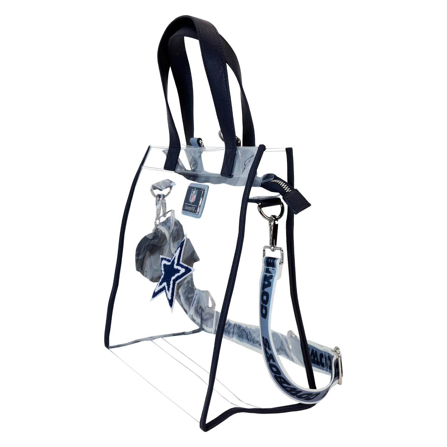 Feeling game-day ready? Cheer on your favorite football team with this convertible tote bag! The clear design makes it easy to bring your belongings into the stadium, and versatile shoulder straps help to keep your bag close as you wander the crowds. A chenille patch of the Cowboys logo, a helmet-shaped bag charm, and coordinating team colors give this bag an elevated look. No need to sacrifice your style at the big game – this accessory is the perfect combination of fashion and function.