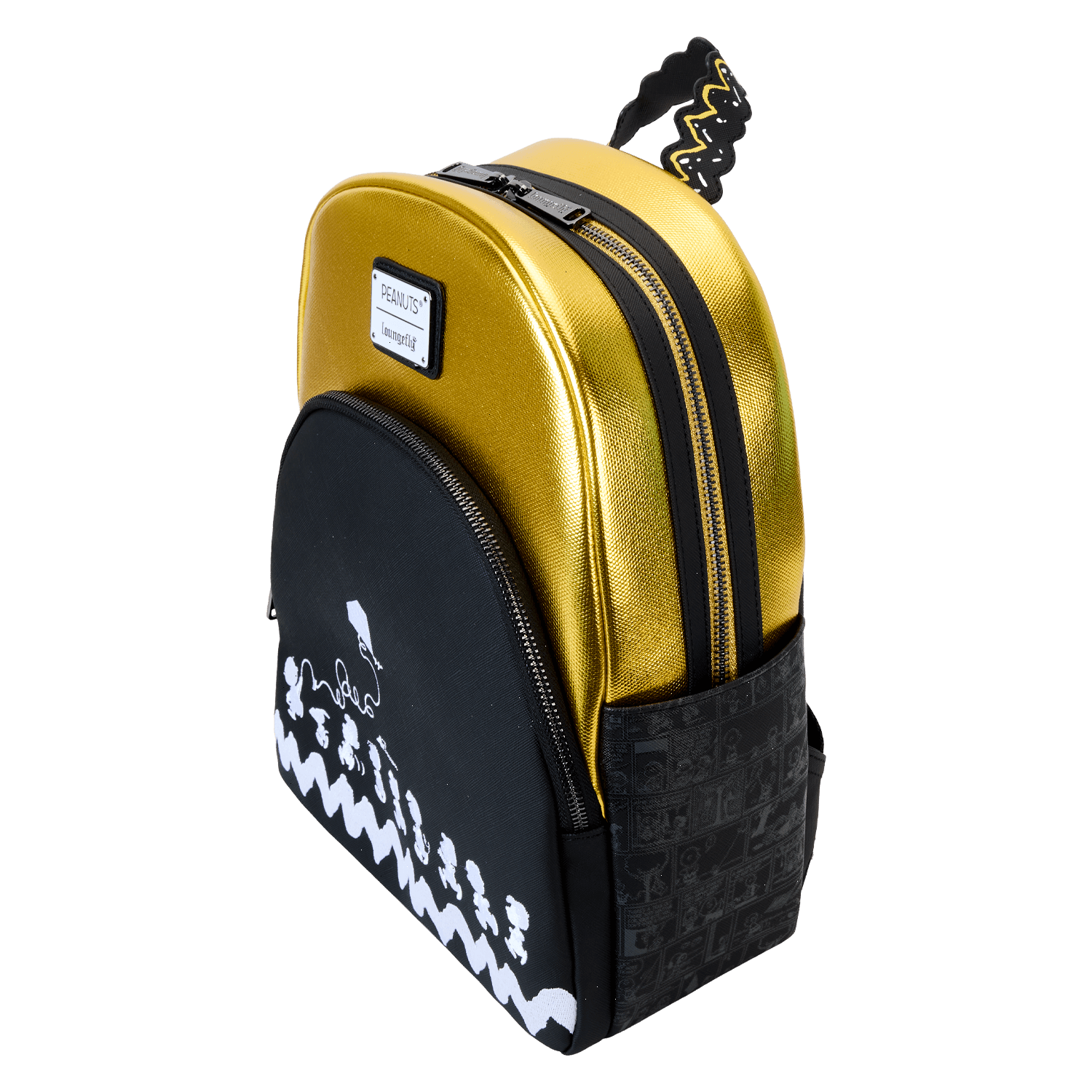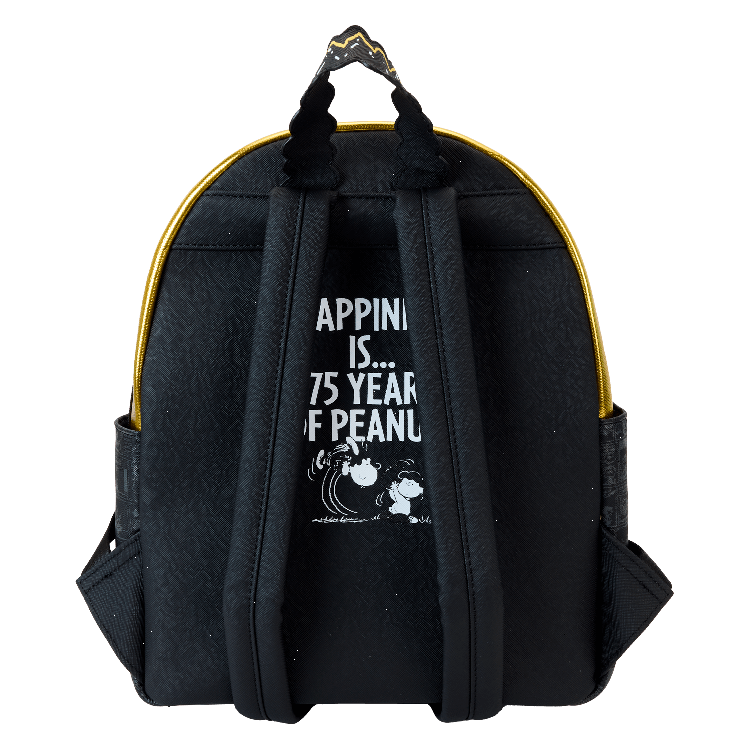 Happiness is…a big celebratory feeling you can take with you wherever you go. Celebrate the 75th anniversary of Peanuts™ with our mini backpack featuring the whole gang. You’ll be able to spot the embroidered silhouettes of Charlie Brown and his friends against a black background on the front pocket. Charlie Brown is flying a kite, and his characteristic wavy line on his shirt appears below. The signature yellow on his shirt appears above as a shiny, textured detail. The wavy line makes an encore as a die-cut feature, forming the top handle above. Flip the backpack around, and you’ll find the words “Happiness is…75 years.” Pack your daily essentials to commemorate a milestone anniversary and add a little character of your own.